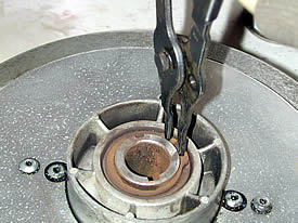 bearing held in by a circlip. I used a snap ring pliers to remove
